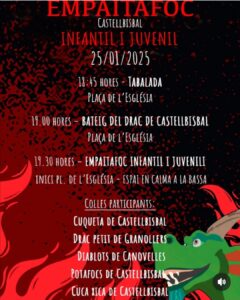 El pròxim dissabte dia 25 de gener es celebra l’Empaitafoc i el bateig del Drac de la Colla Potafocs. També participaran com a Padrins el Drac petit de Granollers i la Cuqueta de Castellbisbal, la colla de diables de Canovelles i la Cuca Xica de Castellbisbal.