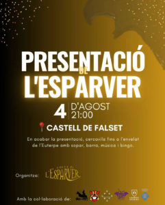 El divendres 4 d’agost, la Colla de l’Esparver presentarà l’Esparver al Castell de Falset amb una gran festa! Després de la presentació, cervavila fina a l’envelat de l’Euterpe, sopar, barra, música i bingo!