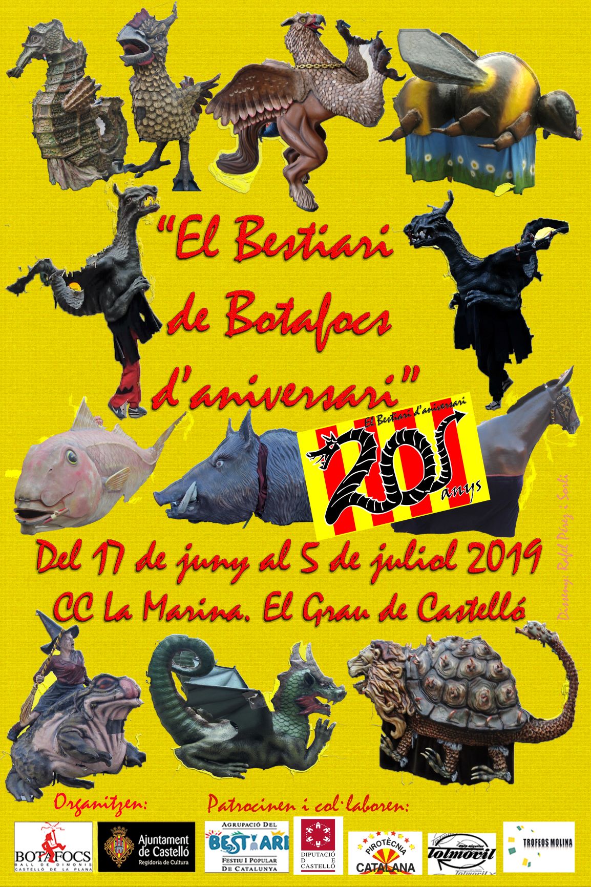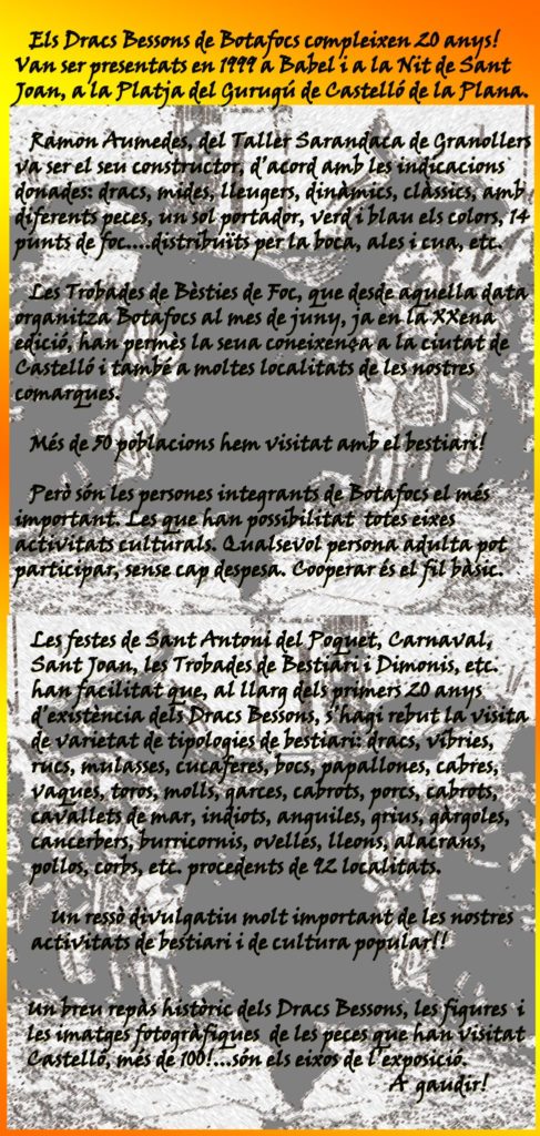 Exposició fotogràfica de més de 100 figures de bestiari que han visitat la ciutat de Castelló en les trobades de bestiari per Sant Antoni i per Sant Joan, per la Nit de Sant Joan…organitzades per Botafocs amb el suport de l’Agrupació de Bestiari, a més de les figures dels Drtacs Bessons que compleixen els seus primers 20 anys, a més d’un recull fotogràfics d ela seua construcció, primeres actuacions, etc.