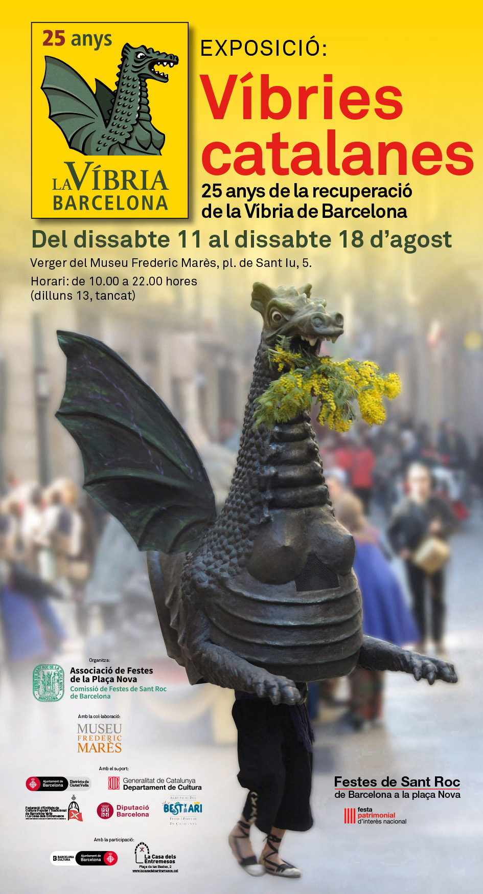 Enguany la Víbria de Barcelona celebra els vint-i-cinc anys de la seva recuperació i des de l’Associació de Festes de la Plaça Nova hem preparat un seguit d’actes per a l’aniversari. Els actes centrals de la celebració es realitzaran durant les 429es Festes de Sant Roc de Barcelona a la plaça Nova, amb l’exposició «Víbries catalanes» -de l’11 al 18 d’agost al Verger del Museu Frederic Marès- i una cercavila i un correfoc, dissabte 18 d’agost com a cloenda de les Festes de Sant Roc… i, el 24 de novembre, a La Casa dels Entremesos, amb la presentació del llibre infantil «El conte de la Víbria».