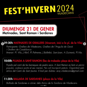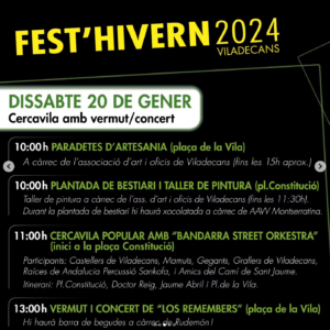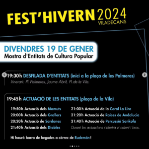 Des del divendres 19 i fins al diumenge 21 de gener de 2024, Viladecans celebra la seva Festa Major d’hivern, el FEST’HIVERN! Amb un munt d’activitats, cercaviles, mostres de cultura popular, músca… US deixem aquí tota l’agenda!