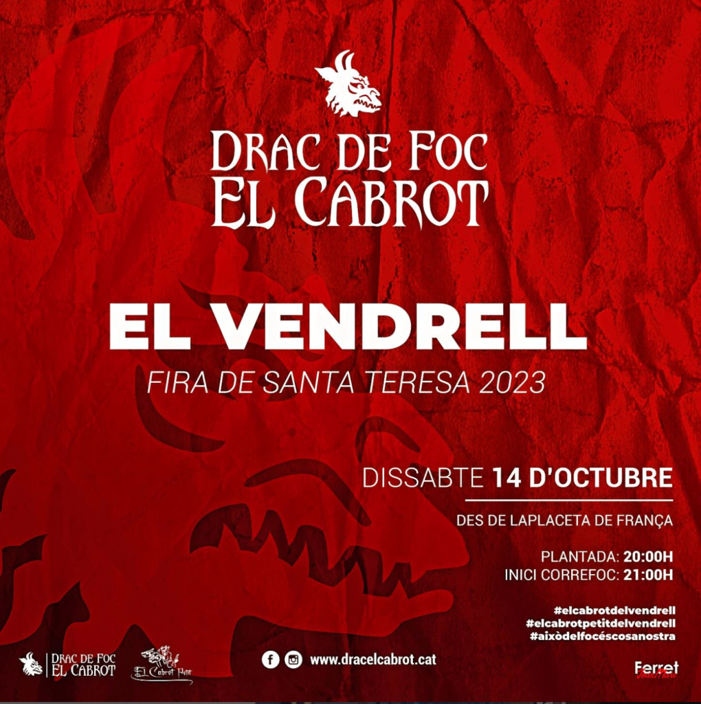 Cercavila de foc amb el Cabrot del Vendrell i el Cabrot Petit el dissabte 14 d’octubre des de la Placeta de França. A les 20 h, plantada i a les 21 h cercavila. Els acompanyarà el Drac de Llorenç del Penedès.