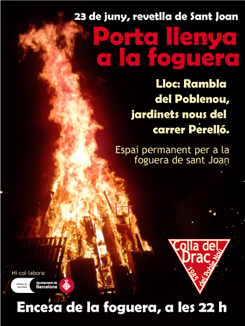 Finalment l’Ajuntament de Barcelona ha acondicionat un espai on podrem fer cada any la foguera de sant Joan. Als nous jardinets del carrer de Perelló, tocant a la Rambla del Poblenou s’hi ha adequat un espai amb les condicions i dimensions adequades per poder fer-hi la foguera de sant Joan.