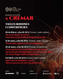 Del 8 de febrer al 31 de maig a la Sala Josep Uclés del Centre Cultural El Carme, a Badalona, hi haurà els Forjadors de la Festa A CREMAR. Durant aquest període es duran a terme diverses Taules Rodones i Conferències: