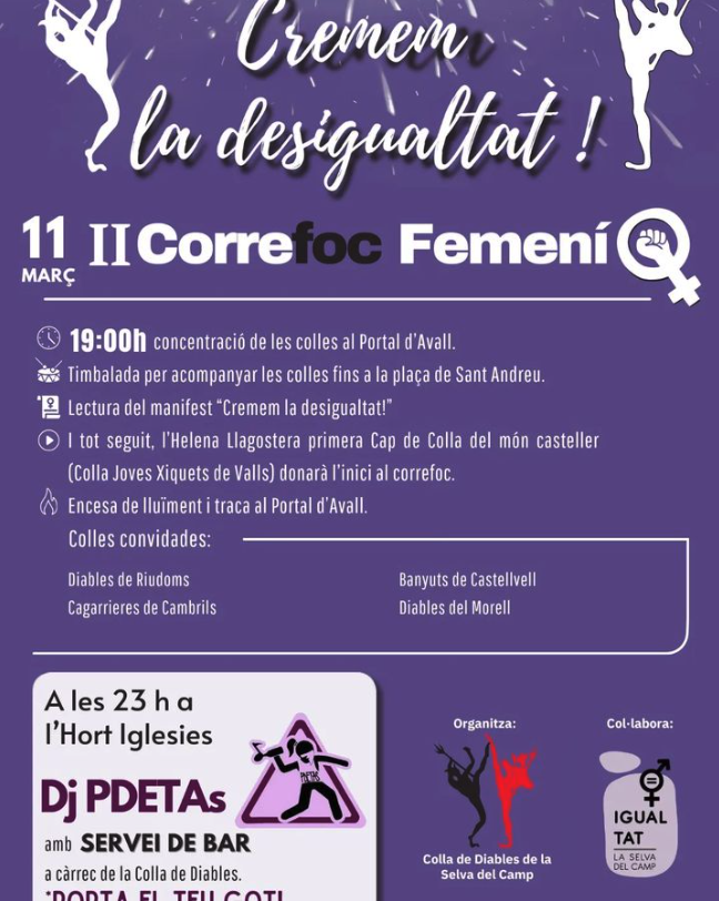 El pròxim dissabte 11 de març, La Selva del Camp acollirà la celebració del II Correfoc Femení. A les set de la tarda, des del Portal d’Avall començarà l’acte amb la concentració de colles. A continuació hi haurà: timbalada per acompanyar les colles fins a la plaça de Sant Andreu, lectura del manifest “Cremem la desigualtat” i correfoc. En aquest cas, Helena Llagostera, primera cap de colla del món casteller (Colla Joves Xiquets de Valls), donarà l’inici al correfoc.