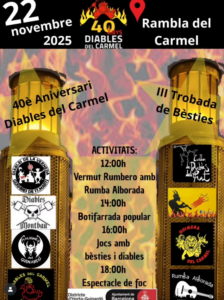El proper dissabte 22 de novembre es celebrarà la III Trobada de Bèsties i el 40è Aniversari dels Diables del Carmel! La colla de Diables del Carmel porta 40 anys fent història arreu de Catalunya i més enllà. Aprofiten el gran dia per convidar diverses bèsties donant lloc a la tercera trobada de bestiari al barri. Vindran el Brumot de Gavà (@ciafocgava) i el Pollo del Prat (@diablesdelprat_) i com a colles convidades de diables: @malignesguinardo @diablesdemontbau @diablesverneda.guspirestmarti