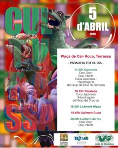 El proper dissabte 5 d’abril, durant tot el dia es celebra La Culturassa 2025 a la Plaça de Can Roca, Terrassa. Amb la participació de les bèsties: Drac Gran, Drac Infantil, Cuca Japonesa i Hipodragona del Grup del Drac de Terrassa. Horaris: