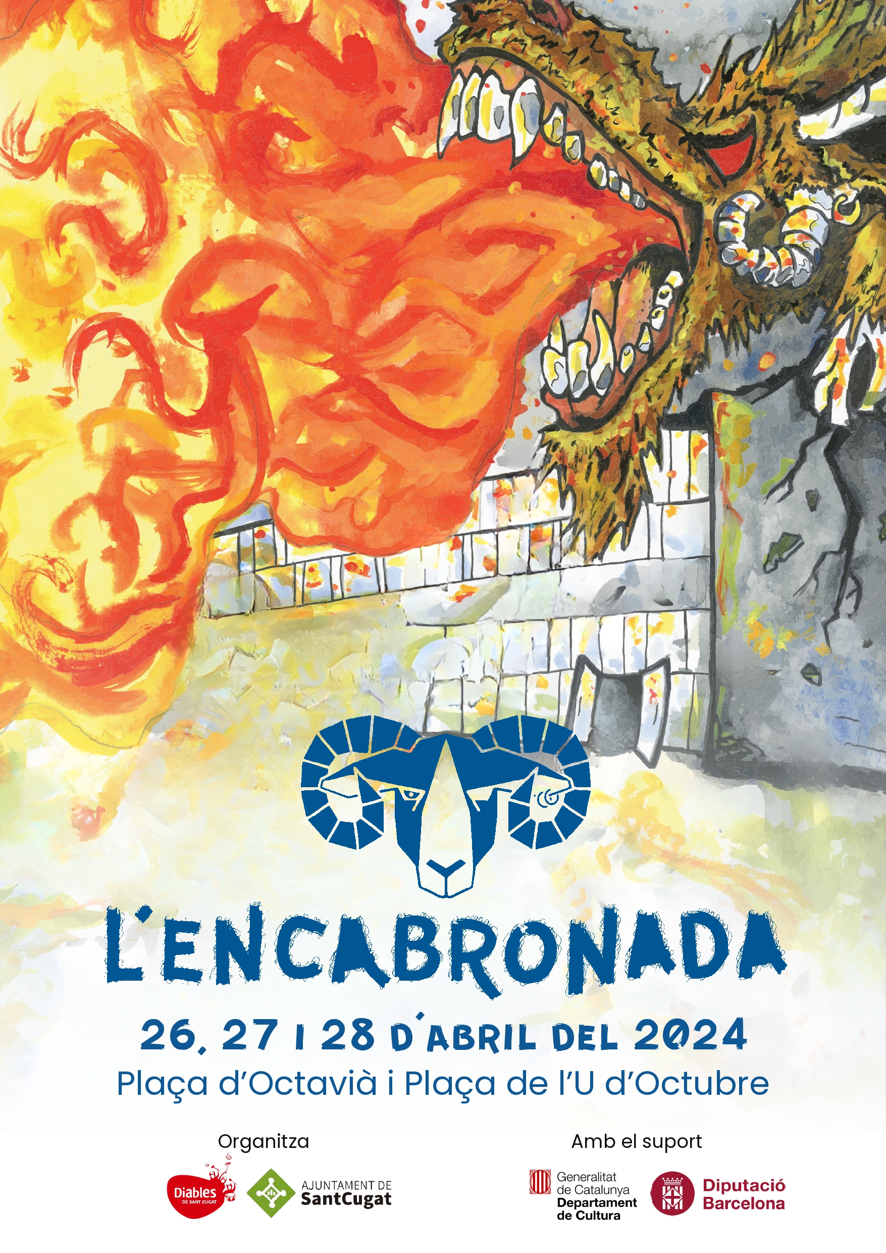 Diables de Sant Cugat presenta la IX Edició de l’Encabronada que se celebrarà els dies 26, 27 i 28 d’abril. Enguany, el festival de música i foc, tornarà a tenir lloc a les places més cèntriques de la ciutat on es duran a terme més d’una vintena d’activitats, entre les quals destaquen l’emblemàtic Bany de Foc on es representa la Llegenda del Boc de Can Vernet en un espectacle de pirotècnia i tabals tradicionals de la colla acompanyats per la cobla Maricel.