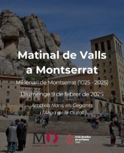 El proper diumenge 9 de febrer, Montserrat viurà la Matinal de Valls, amb motiu de les festes del Mil·lenari del monestir. Serà una actuació conjunta on l’Àliga, els Gegants i els Nans de la Ciutat portats per la Unió Anelles de la Flama, així com els castellers de la Colla Joves Xiquets de Valls i la Colla Vella dels Xiquets de Valls sortiran del municipi per portar les tradicions populars vallenques als peus de la Moreneta.