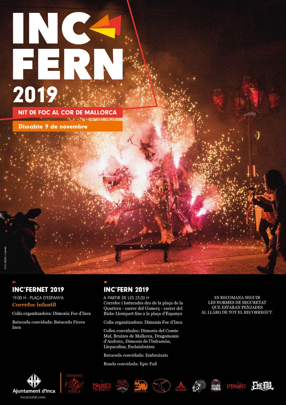 Aquest dissabte se celebra la Nit de Foc Inc’fern al municipi d’Inca. A partir de les 19 hores començarà el correfoc infantil, que anirà acompanyat d’una batucada. Després, a les 23 hores serà el torn del correfoc, que farà la seva sortida des de la plaça de la Quartera.