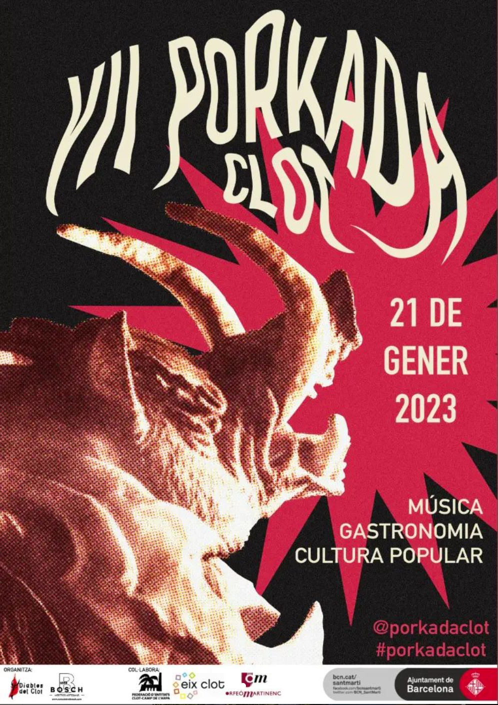 Arriba la VII Porkada Clot. El dissabte 21de gener de 2024 a partir de les 11.00 h la Plaça del Mercat del Clot serà, com sempre, el punt neuràlgic de la #PorkadaClot i durant tot el dia hi podreu tastar unes fantàstiques tapes i gaudir de les activitats que hi ha programades.