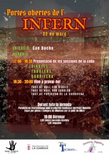 El proper dissabte 22 de març, a partir de les 17:00h, a la plaça de Can Dachs podreu provar les diferents seccions del Front Diabolic! Vine a descobrir-ho i participa en les activitats que han preparat especialment per a vosaltres! Horaris: