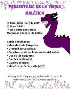 El proper 22 de març a les 19h t’espera la presentació de la Víbria Malèfica. Una nova bèstia arriba a Vilanova i la Geltrú, la seva presentació es farà a la Porta del Mercat Municipal.