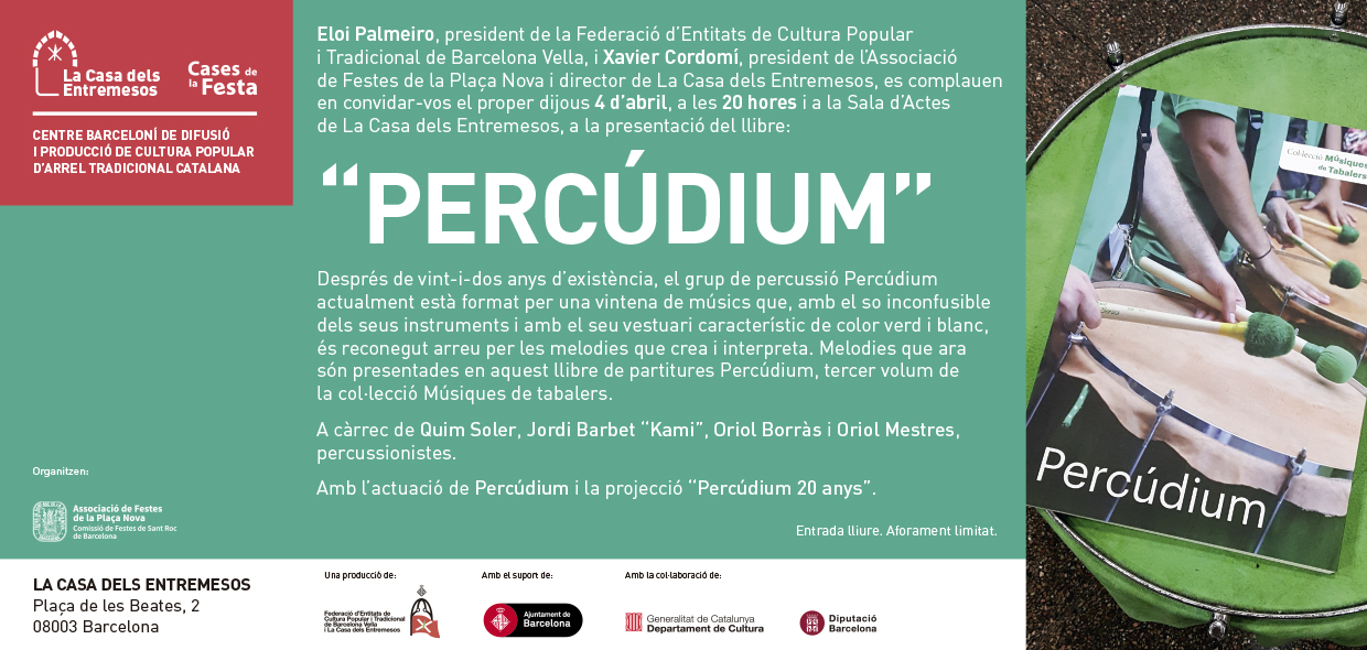 La presentació serà a càrrec de Quim Soler, percussionista i editor del llibre, Jordi Barbet “Kami”, percussionista, Oriol Borràs, percussionista, i Oriol Mestres, percussionista i membre fundador del grup Percúdium, introduirà de l’acte Xavier Cordomí, president de l’Associació de Festes de la Plaça Nova. Amb l’actuació dels tabalers Percúdium i la projecció de l’audiovisual “Percúdium 20 anys”.