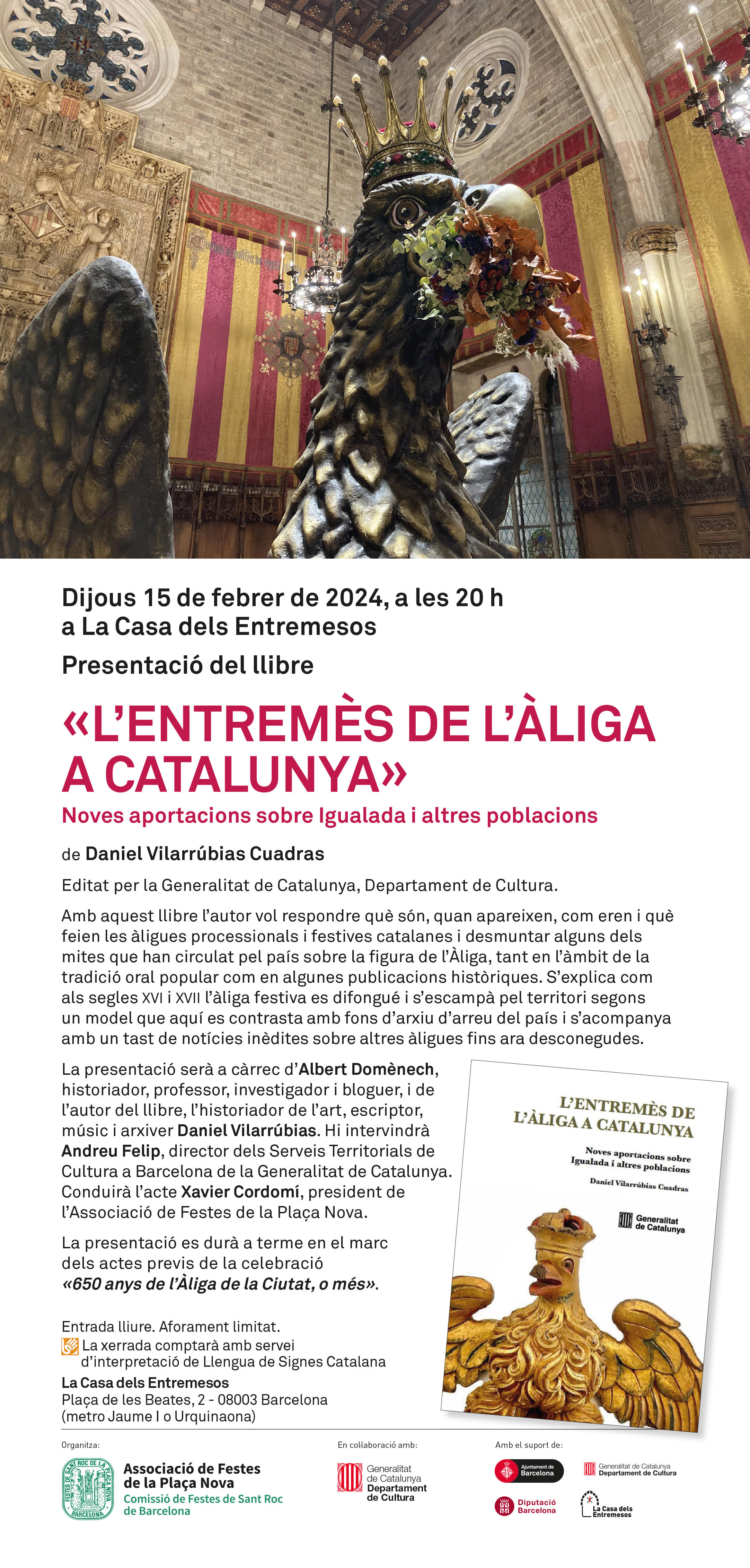 Dijous 15 de febrer de 2024, a les 20.00 hores a La Casa dels Entremesos (plaça de les Beates, 2 – 08003 Barcelona), l’Associació de Festes de la Plaça Nova durà a terme la presentació del llibre: L’entremès de l’Àliga a Catalunya. Noves aportacions sobre Igualada i altres poblacions de Daniel Vilarrúbias Cuadras. Editat per la Generalitat de Catalunya, Departament de Cultura.