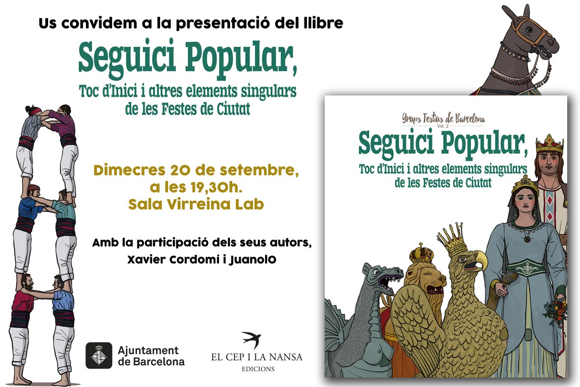 Ens plau convidar-vos a la presentació del llibre ‘Seguici Popular. Toc d’Inici i altres elements singulars de les festes de ciutat’, el segon volum de la col·lecció ‘Grups Festius de Barcelona’ que es farà el dimecres 20 de setembre a les 19.30 a la sala Virreina Lab. Es tracta d’un llibre editat per El Cep i la Nansa que compta amb textos de Xavier Cordomí i il·lustracions de Juanolo.