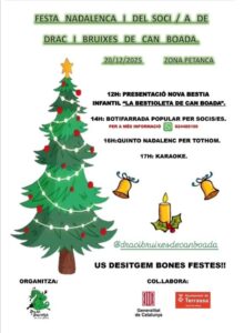 El proper 20 de desembre a les 12h es presentarà la nova bèstia infantil “La Bestioleta de Can Boada”, de la colla del Drac i Bruixes de Can Boada. S’estrenarà en el marc de la Festa Nadalenca i del Soci a Terrassa (Zona Petanca). A les 14h hi haurà Botifarrada Popular pels Socis, a les 16h Quinto Nadalenc per a Tothom i a les 17h Karaoke.