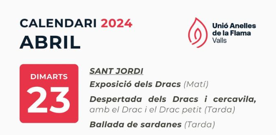 « All Esdeveniments Aquest event ja ha passat. Sant Jordi Dracs Valls 23 d'abril de 2024 Navegació d'Esdeveniment « Conte amb el Bakardat L’Encabronada » La propera diada de Sant Jordi, la UAF de Valls ho cel.lebrarà. + Google Calendar+ Exportar iCal Detalls Data: 23 d'abril de 2024 Esdeveniment Category: El Camp-Conca-Priorat Etiquetes de l'Esdeveniment:cercavila, exposició