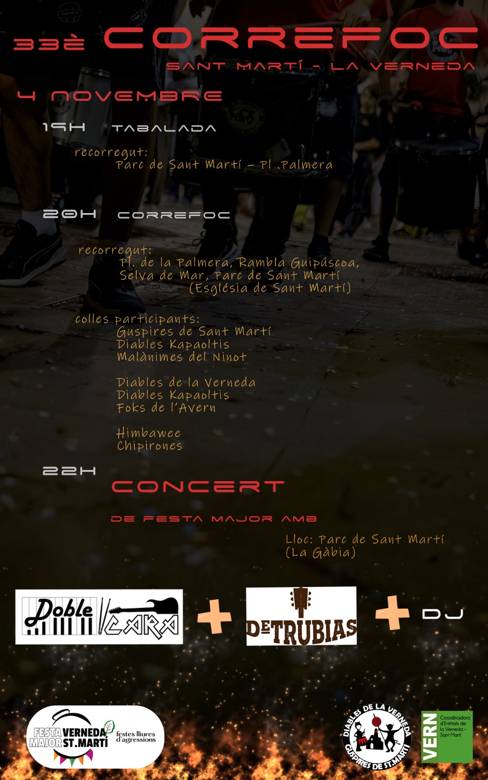 « All Esdeveniments Aquest event ja ha passat. Tabalada i correfoc a la FM La Verneda Sant Martí 2023 4 de novembre de 2023 19:00 a 23:30 Navegació d'Esdeveniment « Presentació de la nova Bèstia la Dragoneta de les Roquetes! Ceptrotada a Premià de Mar 2023 » El dissabte 4 de novembre, en el marc del Festa Major de La Verneda Sant Martí 2023 podreu gaudir de la tabalada, el correfoc i una nit de festa amb música i DJ! + Google Calendar+ Exportar iCal Detalls Data: 4 de novembre de 2023 Hora: 19:00 a 23:30 Esdeveniment Categories: Activitats associats, Barcelona Ciutat, Territorials Etiquetes de l'Esdeveniment:bestiari, correfoc, festa major, tabalada Web: https://www.instagram.com/diablesverneda.guspirestmarti/