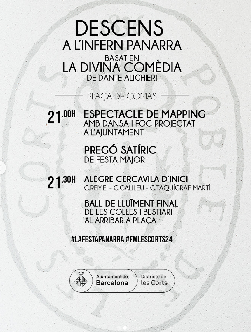 ✍️ El primer dia de festes, el divendres 4 d’octubre, foc, dansa, percussió i mapping projectat a l’ajuntament de les Corts. Enguany l’espectacle basat en el descens als inferns de “La Divina Comèdia” de Dante Alighieri.