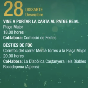 Dissabte 28 de desembre, a partir de les 18 h pots portar la cartal al Patge reial i a les 20 h, trobada de bèsties de foc amb correfoc!