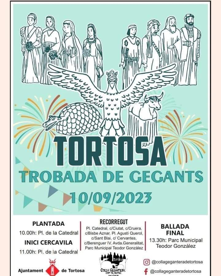 El dissabte 10 de setembre de 2023 a les 11 h, tindrà lloc la trobada de gegants de Tortosa. La plantada serà a les 10 h a la plaça de la Catedral i a les 13.30 h al Parc Municipal Teodor Gonzàlez.