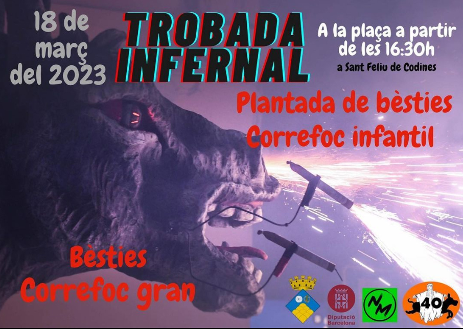 El Grup del Correfoc el Follet i la Fantasma de Sant Feliu de Codines (Vallès Oriental) celebrarà el pròxim dissabte 18 de març una nova edició de la Trobada infernal. Aquell dia a la plaça de Josep Umbert Ventura, a partir de les 16.30 h, hi haurà: