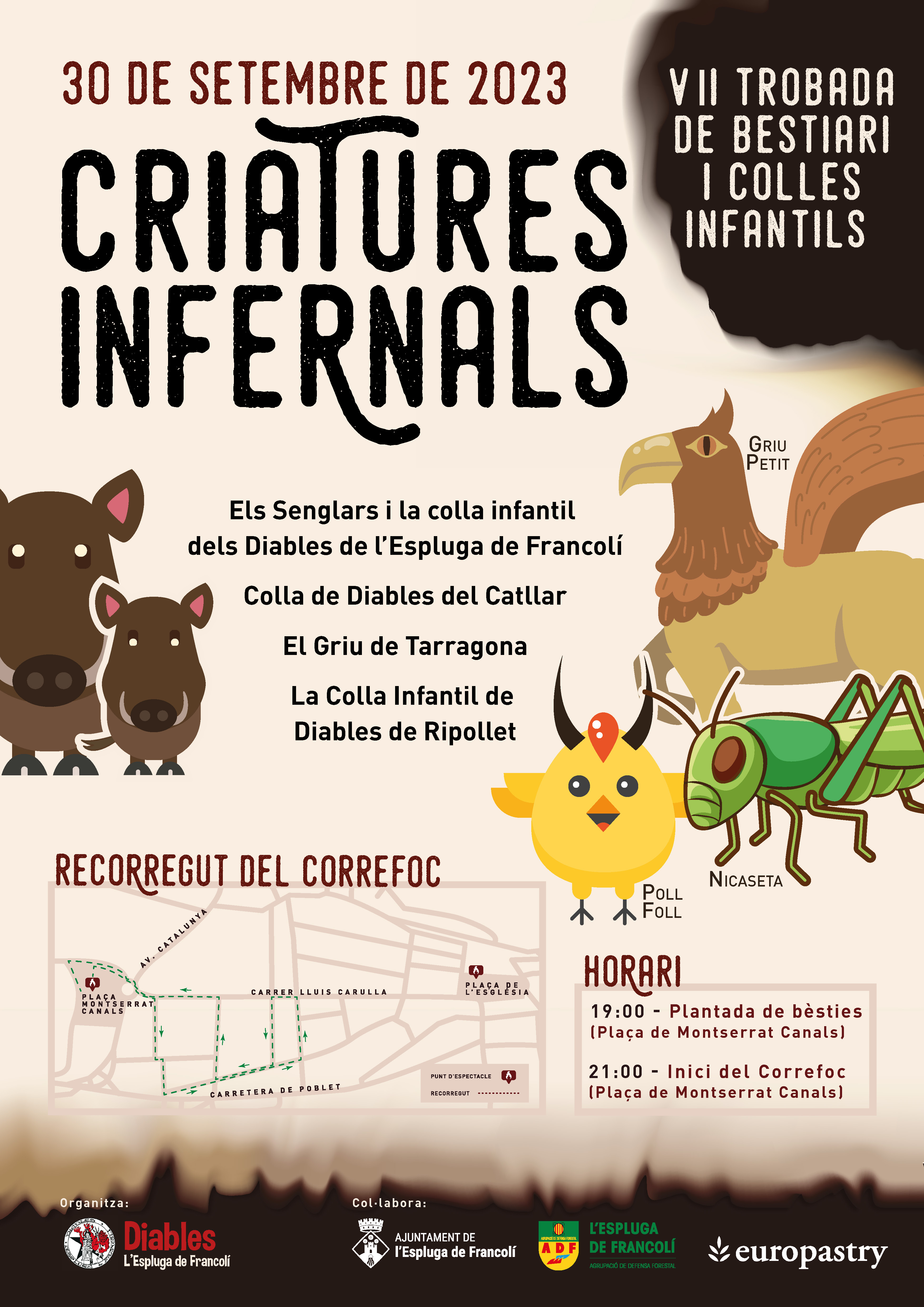 Els diables de l’Espluga de Francolí han programat la VII edicó de Criatures infernals on participaran els dos senglars de la colla dels diables d’Esplugues i els diables kids, també els acompanyarà la colla infantil dels @diablesdelcatllar, el @griutarragona i la colla infantil dels @diablesderipollet i la seva bèstia Poll Foll.