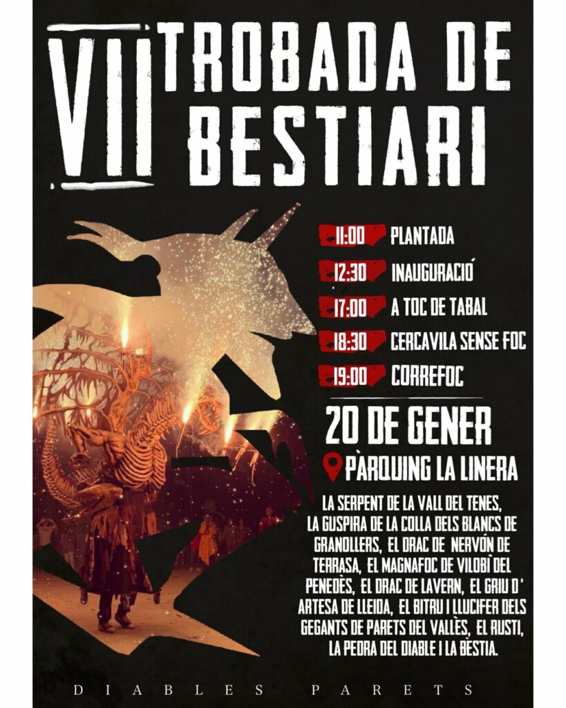 Un any més, els Diables de Parets tornen a organitzar la seva trobada de bestiari que tindrà lloc el dissabte 20 de gener a partir de les 11 h al pàrquing de la Linera, Parets del Vallès.