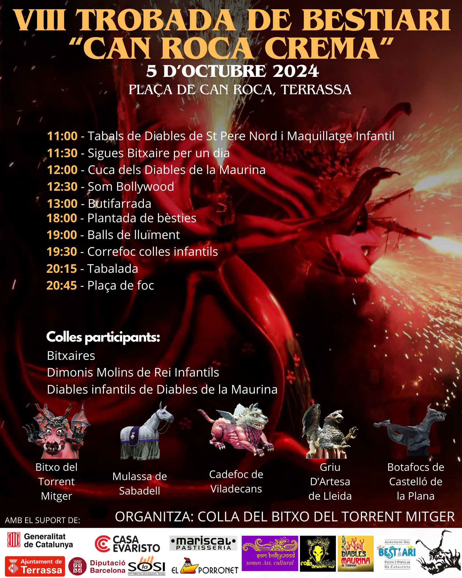 El dissabte 5 d’octubre, a la plaça Can Roca de Terrassa tindrà lloc la VIII Trobada de Bestiari que organitza la colla del Bitxo del Torrent Mitger. Us deixem el cartell amb tota la informació i activitats previstes, us hi esperen!