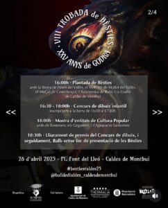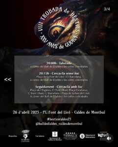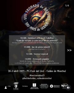 El dia 26 d’abril es celebra la VIII Trobada de Bèsties pels XXV anys de Godra a Caldes de Montbui! Tindrem una programació molt variada i per a totes les edats! Començant pel Seminari “Com fer versots (o com tocar bé els pebrots)” de @jordicubillos, passant pel Joc de pistes infantil, Vermut, Arrossada Popular (només a 8’50€!), Concurs de dibuix infantil… I acabant amb una bona dosi de foc