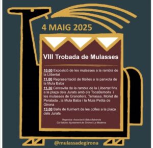 El proper diumenge 4 de maig, en el marc de les Festes de Primavera de Girona, a partir de les 10h, a Girona, es celebrarà la VIII Trobada de Mulasses. Aquest any hi haurà com a convidades les mulasses de Granollers, Terrassa i Mollet de Peralada, a més de les amfitriones: la Mula Baba i la Mula Petita de Girona. També hi haurà els TocaBemolls acompanyant la trobada.