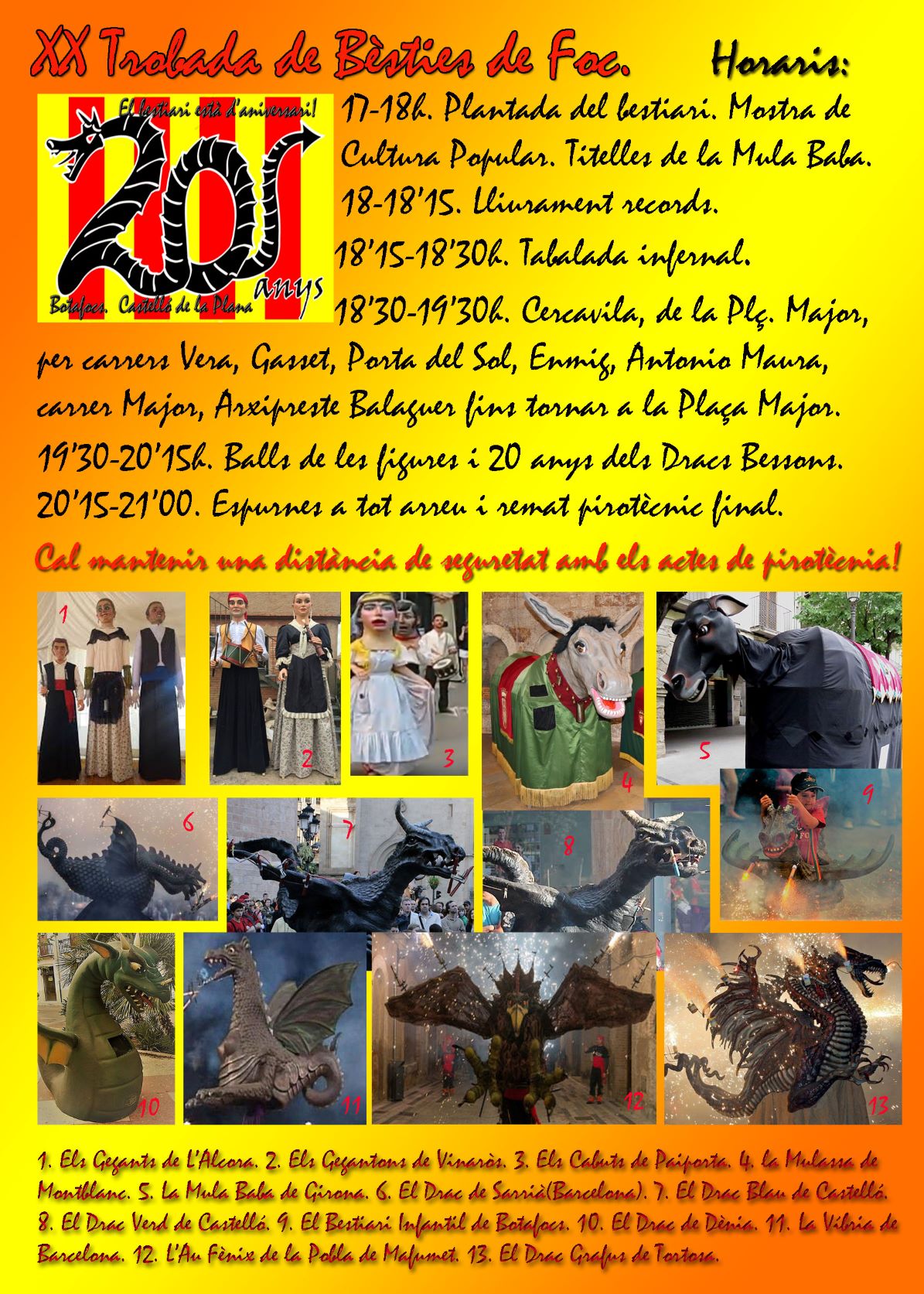 Celebració dels 20 anys dels Dracs Bessons de Castelló de la Plana, de Botafocs, que coincideix amb la XXena edició de la Trobada de Bestiari més arrelada de tot el País Valencià. Seguin el seu possicionament eclèctic, s’ha convidat a entitats de cultura popular de diferents comarques i prefrerentment amb una primera visita a la ciutat, amb varietat d’ements festius, i per tot això s’ha convidat a entitats de gegants(L’Alcora i Vinaròs), de Cabuts(Paiporta), i bestiari(Girona, Barcelona, Montblanc, Tortosa, La Pobla de Mafumet, Dènia…), a més dels amfitrions, Dracs i bestiari Infantil.