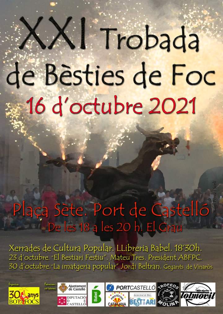 Com ja ve essent tradició, i amb ganes de recuperar una mica la “normalitat”, l’associació Botafocs, ball de dimonis i bestiari de Castelló, ha organitzat pel pròxim dissabte 16 d’octubre la tradicional Trobada de Bèsties de Foc, que enguany ja arriba a la 21a edició. L’acte començarà a les sis de la tarda, a la plaça de Sète, al costat del Port de la ciutat. Allà, envoltats de terra i aigua, els visitants podran conèixer diferents bèsties, cabuts i gegants del territori i fins i tot veure’ls ballar. L’activitat comptarà amb la participació de 13 colles: