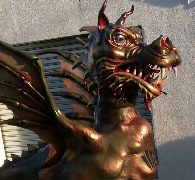 És una peça d’estil barroc de color bronze i verd, amb la boca semioberta on deixa entreveure les dents i la llengua, les ales són paral·leles al cos on es distingeix l’estructura òssia i la membrana, els ulls són de color blau i plata, s’il·luminen de nit convertint-se en color vermell, la cua és recaragolada i acabada amb una punxa que recorda la del drac antic.