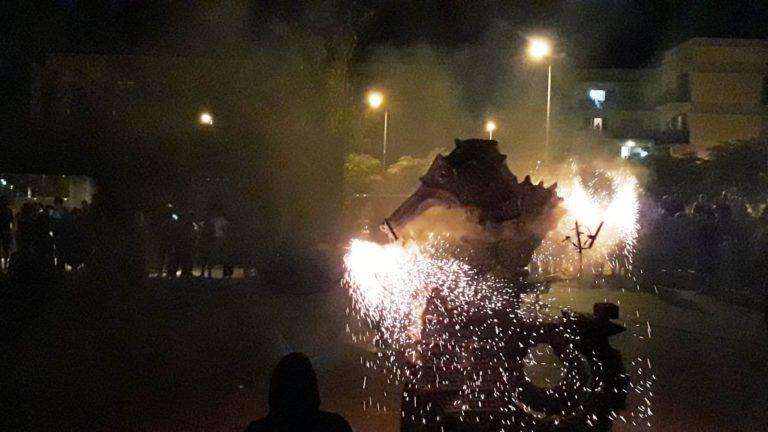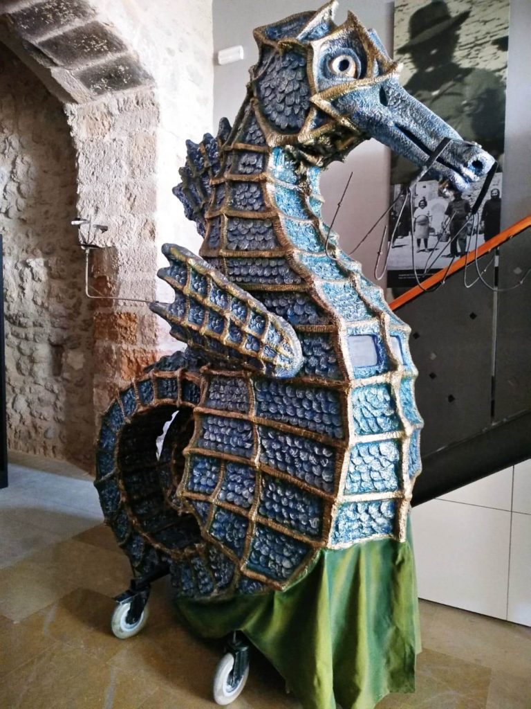 El cavallet de mar que podeu veure a la portada dels programes de l’aplec, s’ha convertit fa anys en el logotip de l’Aplec de Sardanes a la vora de la Mar de l’Hospitalet de l’Infant, dibuix cedit a la nostra entitat per l’artista local F. Andreu. Com a referència a aquesta il.lustració de la diada sardanista, al símbol d’un poble de la costa mediterrània com l’Hospitalet amb una antiga comunitat de pescadors, vàrem escollir la figura del cavallet de mar per treballar una proposta de Drac Festiu. El disseny de la maqueta ha estat fet conjuntament entre l’escultor Marcel Socias (el mateix que va fer els gegants de la Vila) i el Foment Cultural. Una obra meravellosa que situa un peix petitot en el món del Bestiari de Foc i de Festa que sense dubte, és molt original i representatiu del nostre poble. Qui sap si fem representacions de vells contes d’antics pescadors a la vora de la mar: de com fa molt anys… Neptú, en la mitologia romana, déu dels mars, va fer una obra meravellosa amb un Cavallet de Mar. De com un peix petitot el va transformar en una bestiola sortida de la profunditat de les aigües i feia espantar els pirates del coll de Balaguer. Tenia el seu refugi a la cova de la platja del Torn, anomenada cova del Llop Marí. Aigües endins les ones reflectides en les roques on també pengen les rata-pinyades.