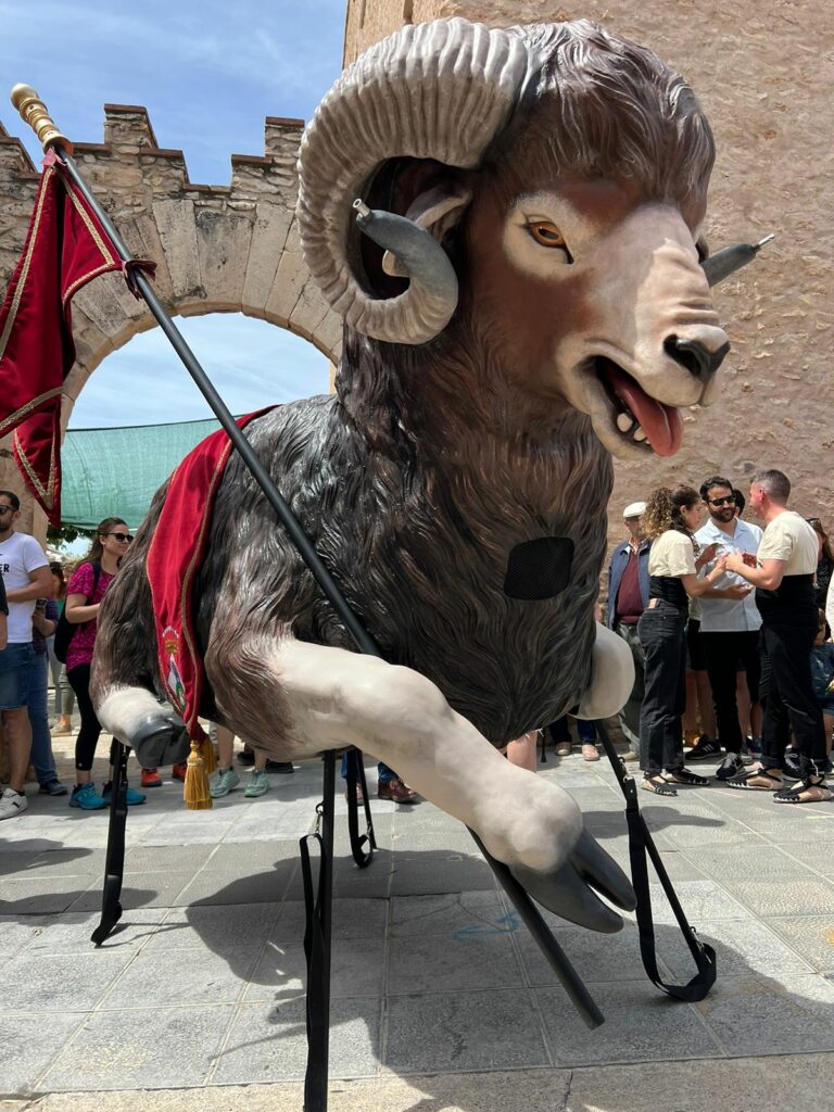 Marrà amb banyes cargolades en posició ajaguda i sostenint un estàndard