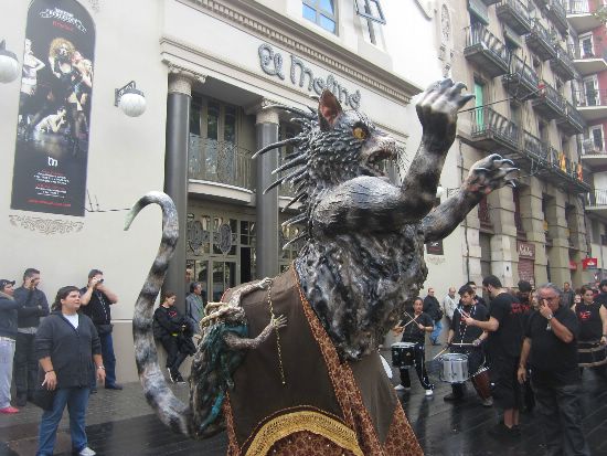 Es tracta d’un gat ferotge i agressiu relacionat amb la font del Gat, situada a Montjuïc i element característic i popular del barri del Poble Sec. Segons la tradició, la font del Gat era un indret on es reunien bruixes i s’hi organitzaven aquelarres, tot i que es va fer popular gràcies a una cançó que parlava dels amors d’una minyona i un soldat. Per això el gat porta a banda i banda del llom dos personatges. Un és una bruixa i l’altre un mascle cabró, personatge que presidia els aquelarres. La bruixa i el mascle cabró estan lligats per una cadena sobre el llom del gat.