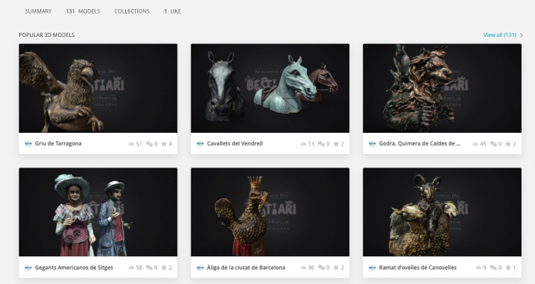 • Arxius 3D en resolució convencional: Estan preparats per a ser descarregats i per a ser inserits en un catàleg web mitjançant un visor. El seu accés és lliure, amb restriccions que porten implícita la llicència Creative Commons amb atribució d’autor i sense fins comercials. Es tracta de fitxers dirigits a centres educatius, o al públic en general, pensats per a ser impresos amb impressores 3D de gamma domèstica i mitja.